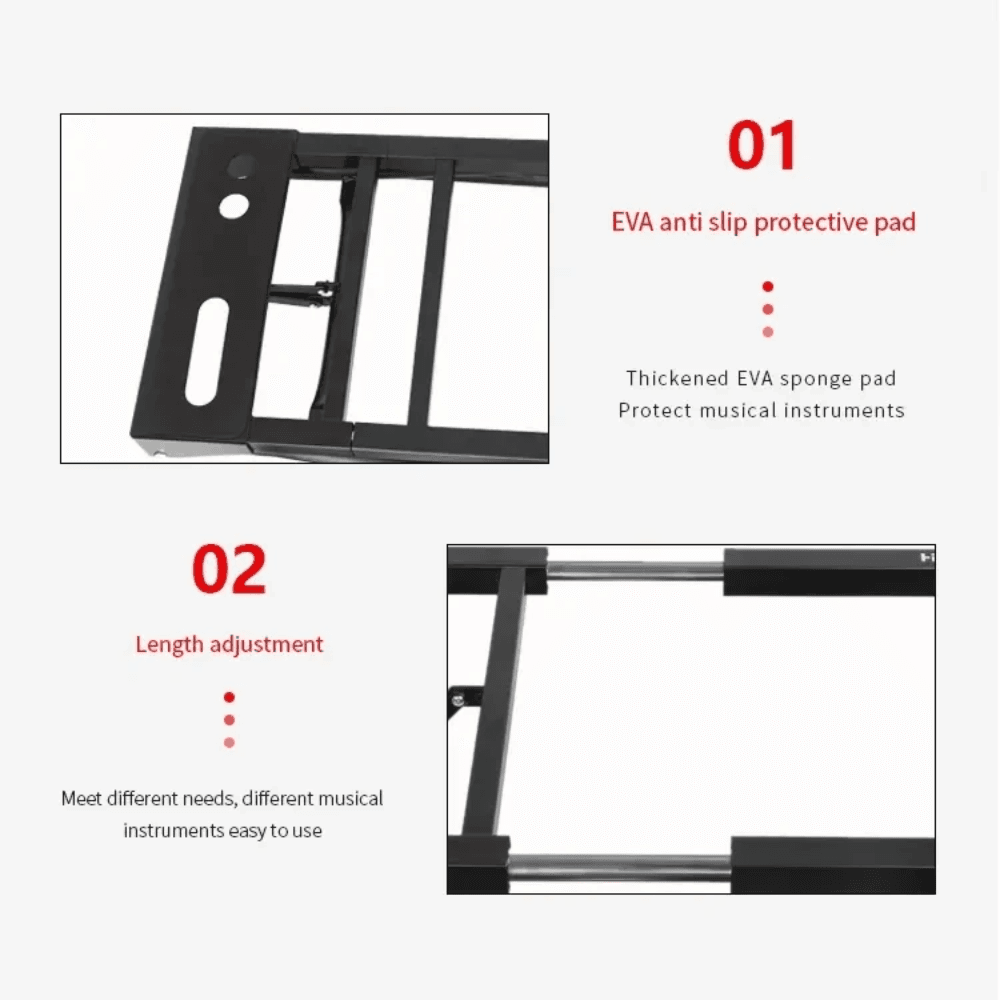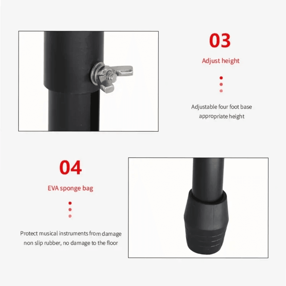 Con su diseño amplio y ajustable, el Q-250 ofrece mayor flexibilidad y personalización para la configuración de su teclado o piano eléctrico. Cuenta con un diámetro de tubo grueso y ajuste de longitud, lo que le permite adaptarse a varios tamaños de teclados y pianos eléctricos.  Además, el Q-250 viene con pies de goma antideslizantes, que garantizan una perfecta estabilidad en cualquier superficie del suelo, sin miedo a resbalar o deslizarse.