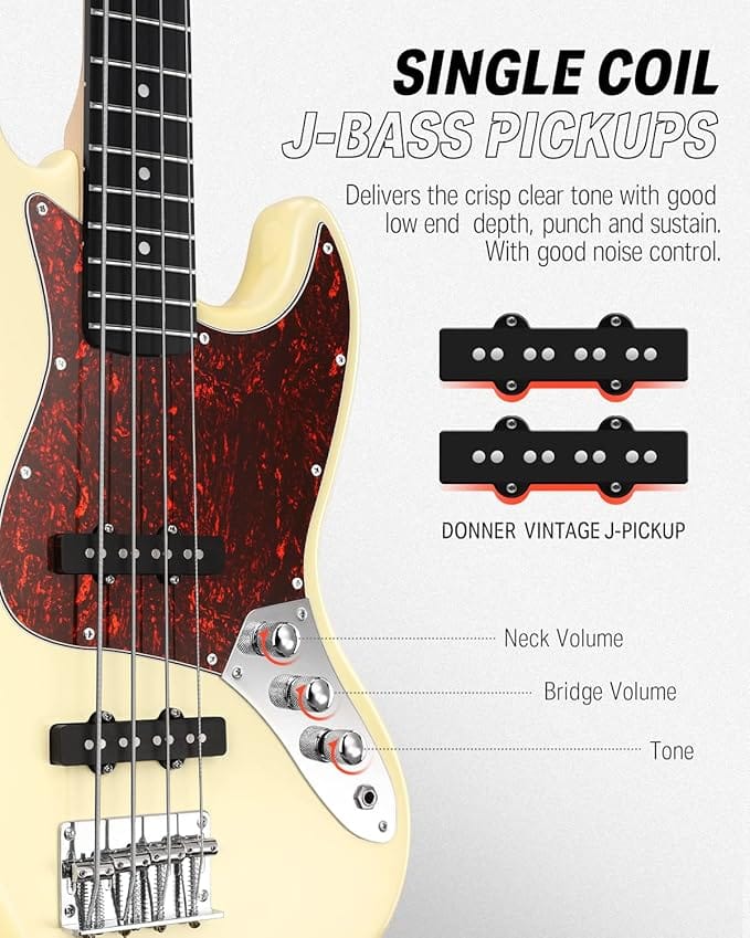- Pastillas J-Bass de bobina simple: Equipado con un par de pastillas J-Bass de bobina simple cerámicas. Gracias a la afinación especial del equipo de ingenieros de Donner, este bajo ofrece un sonido nítido y claro con buena profundidad, pegada y sustain en graves.