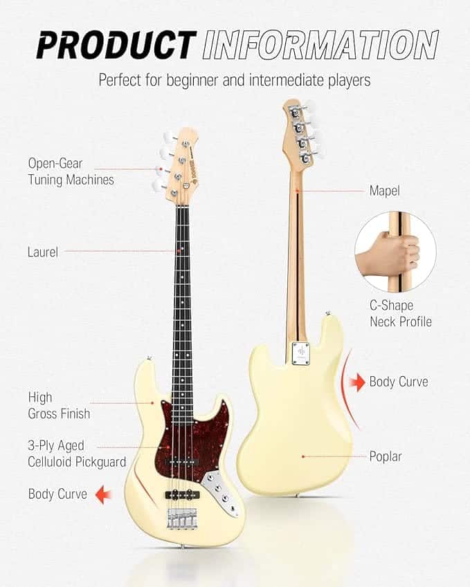 - Incluye los accesorios necesarios: El Donner DJB-510 incluye una funda para bajo, un reposapiés, un cable de guitarra y una correa de guitarra de alta calidad. Listo para tocar desde el primer momento.