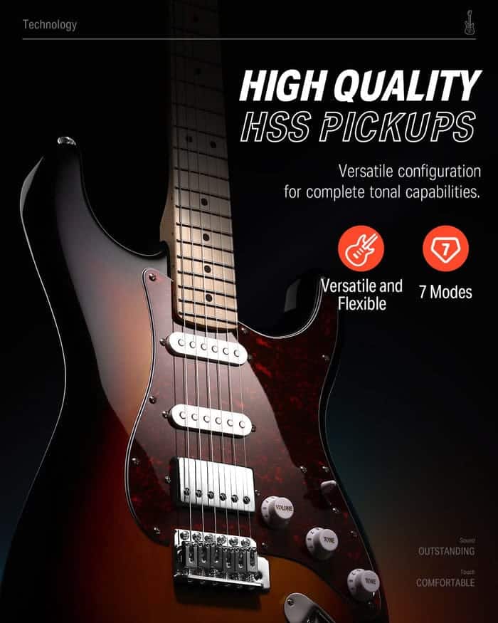 - Pastillas HSS: La pastilla humbucker Donner, fabricada en Corea, proporciona la ganancia justa, con tonos cálidos y nítidos. Con selectores de 5 posiciones y función de división de bobina, la guitarra eléctrica DST-152 crea 7 modos de sonido para satisfacer diversas necesidades con menos ruido. Con 7 modos y 2 controles de tono y volumen, la DST-152 es ideal para diferentes estilos musicales.
