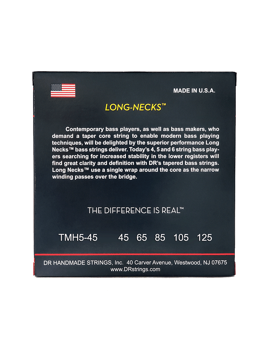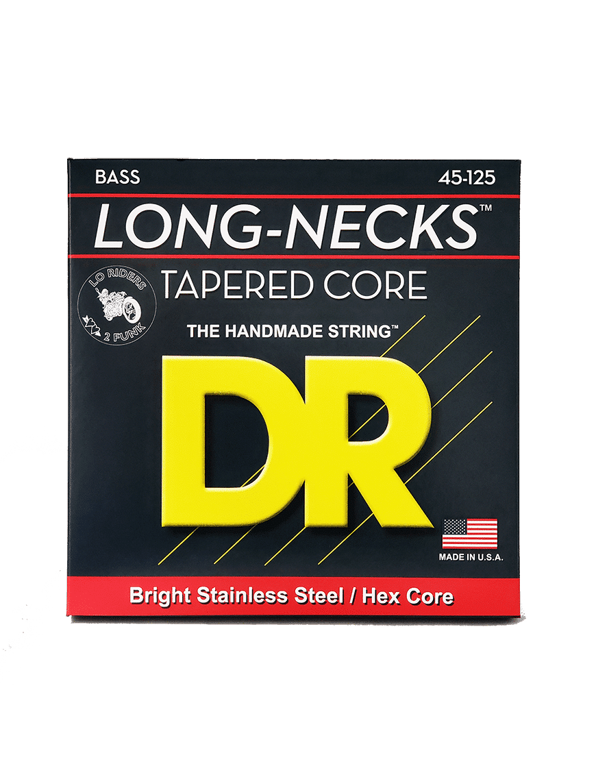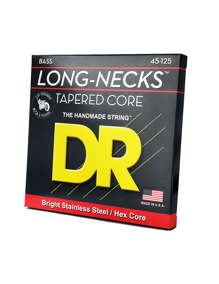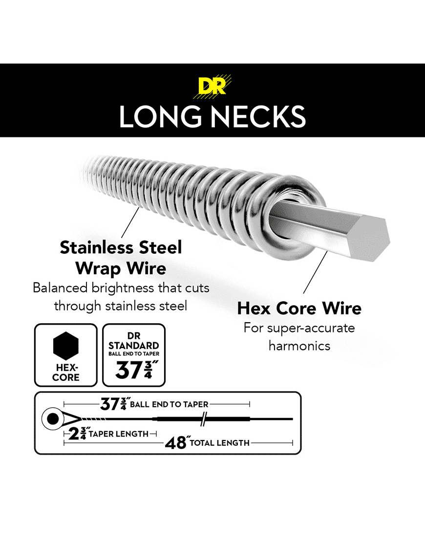 Los bajistas contemporáneos, así como los luthiers, que exigen una cuerda cónica para permitir las técnicas modernas de interpretación del bajo, estarán encantados con el rendimiento superior que ofrecen las cuerdas Long Neck. Los músicos de hoy en día que busquen una mayor estabilidad en los registros inferiores encontrarán una gran claridad y definición con las cuerdas de cuello largo de DR. DR Long Necks utiliza una sola vuelta alrededor del núcleo cuando el devanado angosto pasa sobre el puente.