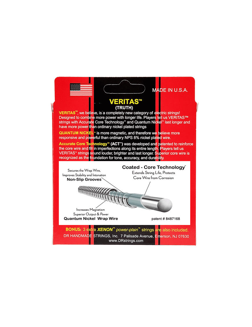 Completamente innovadora de cuerdas para guitarra eléctrica! Diseñado para combinar más potencia con una vida más larga. Los músicos dicen que las cuerdas VERITAS™ con Accurate Core Technology™ (ACT™) y Quantum Nickel™ duran más y tienen más poder que las cuerdas comunes niqueladas. QUANTUM NICKEL™ es magnético y, por lo tanto, es más sensible y poderoso que el cable NPS al 8% niquelado común. Accurate Core Technology™ (ACT™), fue desarrollado para reforzar el cable central y rellenar las imperfecciones a lo largo de toda su longitud. El cable de núcleo superior es reconocido como la base para un tono intenso, precisión de entonación y durabilidad.