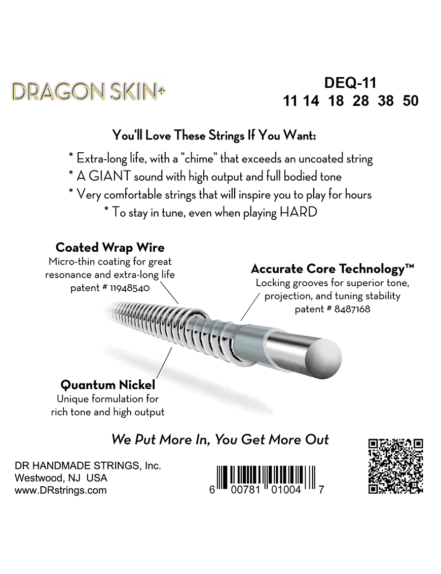 Debajo de los exteriores delgados, las cuerdas Dragon Skin+ cuentan con las mismas cualidades artesanales y la precisión superior que han llevado a los músicos a elegir DR Strings desde el inicio de la marca en 1989. Más allá de su resistencia superior, las cuerdas Dragon Skin+ cuentan con la tecnología patentada Accurate Core Technology (ACT) que impulsa la precisión y la estabilidad de la afinación de primer nivel. ACT, un método avanzado desarrollado por DR, ayuda a eliminar pequeñas imperfecciones en el núcleo de cada cuerda que de otro modo impedirían el rendimiento. El resultado son núcleos de cuerdas uniformes, precisos e infinitamente musicales que están respaldados por la próxima generación de tecnología recubierta.