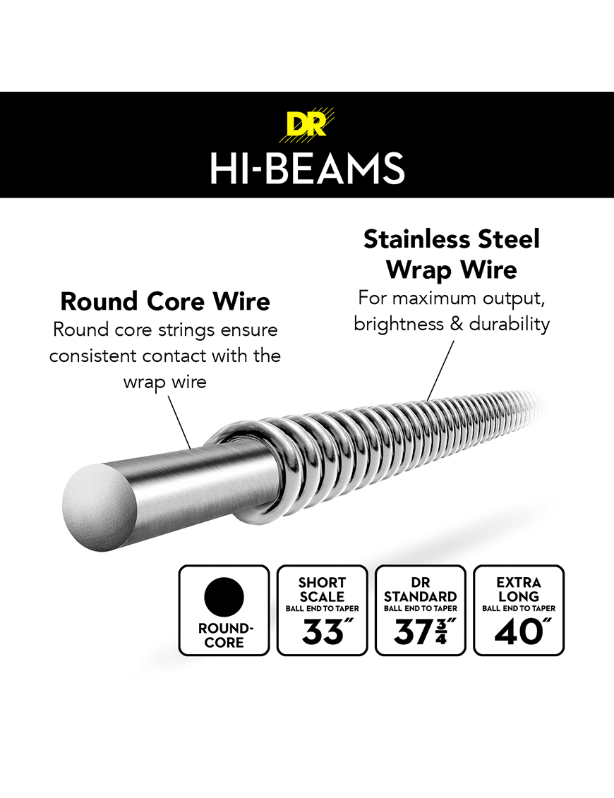 Las cuerdas de bajo de acero inoxidable Hi-Beam están enrolladas en forma redonda y construidas sobre un núcleo redondo que las hace únicas y también requieren más tiempo para construirlas. Este esfuerzo adicional convierte a Hi-Beams en una cuerda de bajo que es muy flexible y musicalmente brillante, pero no ásperamente brillante. No se comen los trastes, son duraderos y tienen una vida inusualmente larga. Las HI-BEAMS son la cuerda a elegir por su brillo, pegada y facilidad de ejecución.