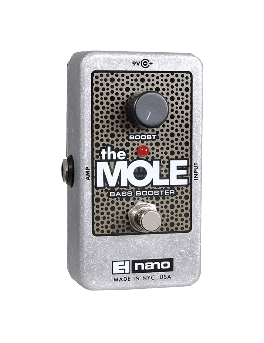 Solo hay dos controles en The MOLE. El interruptor de pie de encendido/apagado se activa y se desactivaThe MOLE y la perilla giratoria Boost reaccionan como un refuerzo de frecuencia específico control. La perilla única es realmente una ganancia de preamplificador. Cuanto más alto esté el mando Boost se aplica más ganancia, desde un extremo inferior engrosado hasta un poderoso Overdrive empuje a su amplificador. En la configuración máxima, recibe 20 dB de ganancia en el preseleccionado Rango de frecuencia de graves de 200 Hz (el impulso se detiene en 400 Hz). Entender la configuración de entre The MOLE y su amplificador es fundamental. Al realizar la configuración por primera vez, asegúrese cuidado con el control Boost. Experimente con la interacción de The MOLE y su amplificador en diferentes configuraciones. Aprenderá los ajustes que reaccionan mejor con su instrumento. Una vez que comprenda la interacción correcta entre su instrumento y amplificador verá el enorme y variado potencial que ofrece The MOLE.