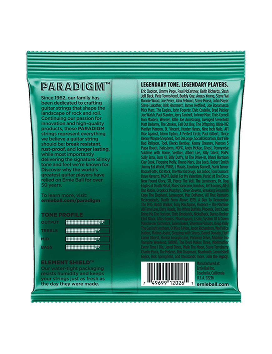 Las cuerdas de guitarra eléctrica Ernie Ball® Slinky Paradigm proporcionan una fuerza sin precedentes y una vida útil más larga al tiempo que conservan el tono y la sensación 100% Slinky. El acero de ultra alta resistencia líder de la industria de Ernie Ball® se incluye en las cuerdas enrolladas y planas junto con un refuerzo patentado en el giro del extremo de la bola de cada cuerda plana para proporcionar una resistencia superior a la tracción y la fatiga para las cuerdas que se afianzan rápidamente y se sostienen debajo Los estilos y condiciones de juego más estresantes. El acoplamiento del nanotratamiento Everlast de Ernie Ball® con un alambre de envoltura mejorado con plasma innovador proporciona resistencia a la corrosión adicional y una acumulación reducida de acumulación y desechos que roban el tono. Experimenta el primer conjunto de cuerdas más duraderas que vale la pena jugar con todos los beneficios y sin compromisos.