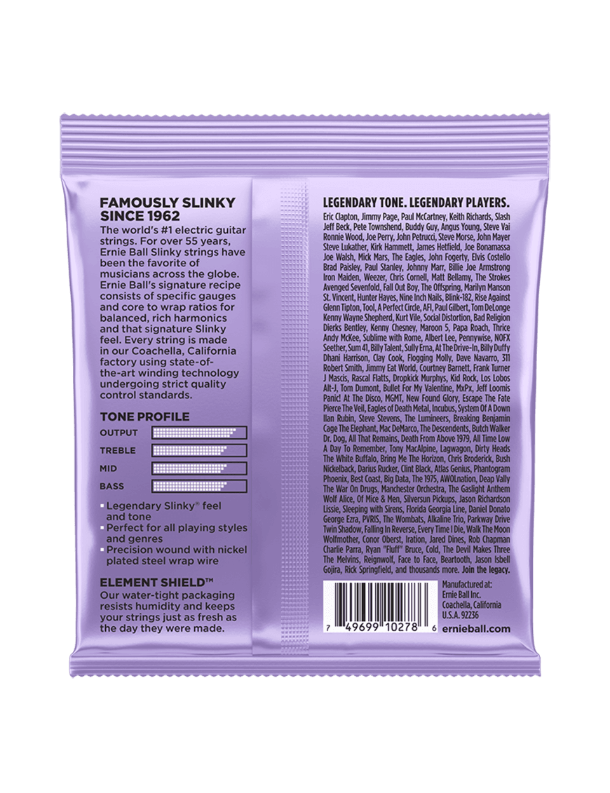 Las cuerdas de la guitarra eléctrica Ernie Ball® Nickel Wound están hechas de alambre de acero niquelado enrollado alrededor de alambre de núcleo de acero con forma hexagonal estañado. Las cuerdas lisas están hechas de acero al carbono altamente templado estañado especialmente templado que produce un tono bien equilibrado para su guitarra.