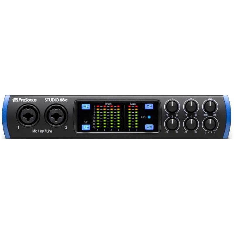 Cargado con cuatro preamplificadores XMAX de sonido dulce, el PreSonus Studio 68c está hecho a medida para pequeñas bandas, productores y pequeños estudios. Más allá de eso, seis salidas brindan flexibilidad de monitoreo adicional y posibilidades de procesamiento de efectos externos. También obtienes E / S S / PIDIF, junto con E / S MIDI para tu controlador de teclado, por lo que trabajar con instrumentos virtuales es muy sencillo. Los DJ apreciarán la selección de auriculares Cue Mix A / B de Studio 68c. Y puede comenzar a grabar de inmediato con el software Studio One Artist incluido y el paquete de complementos Studio Magic. Si recién está comenzando con la grabación, PreSonus Studio 68c le dará todo lo que necesita para comenzar a trabajar, ¡solo agregue música! No importa qué tipo de grabación realice, la interfaz de audio USB-C PreSonus Studio 68c superará tus expectativas